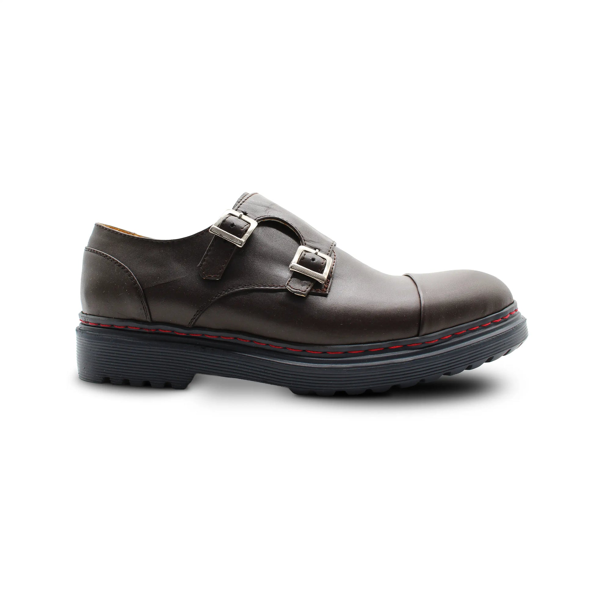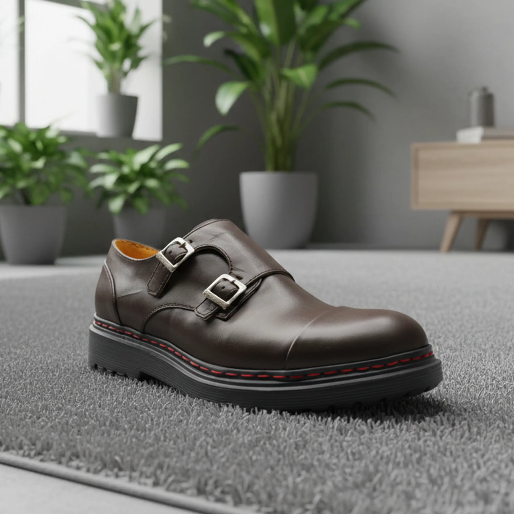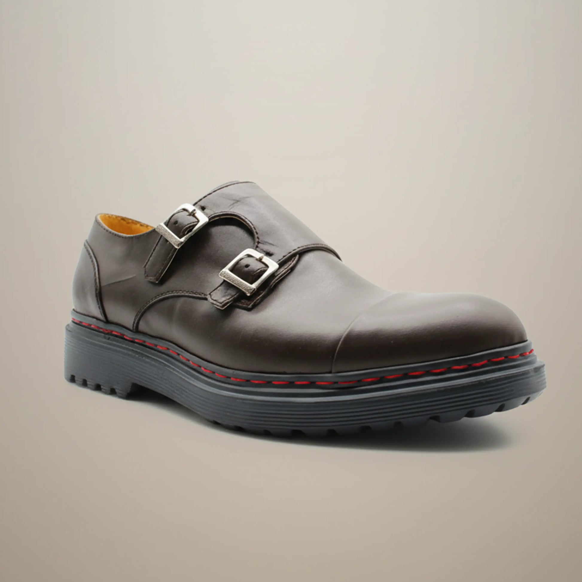 Este choclo en piel café chocolate es una expresión de sofisticación relajada. Su diseño sin cordones, acentuado por dos hebillas metálicas, ofrece un ajuste seguro y un estilo que fluye con naturalidad.