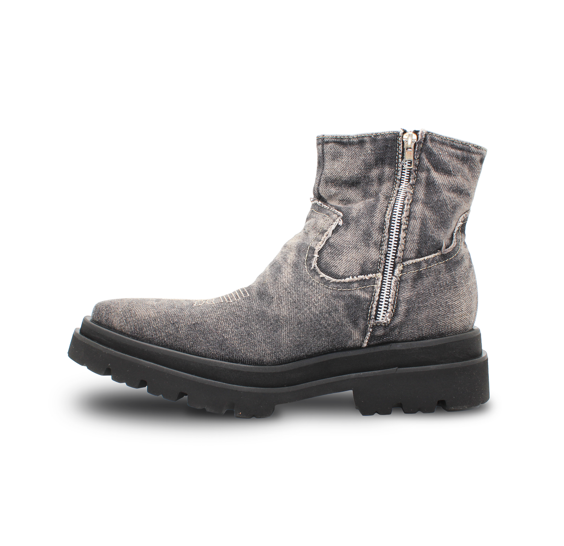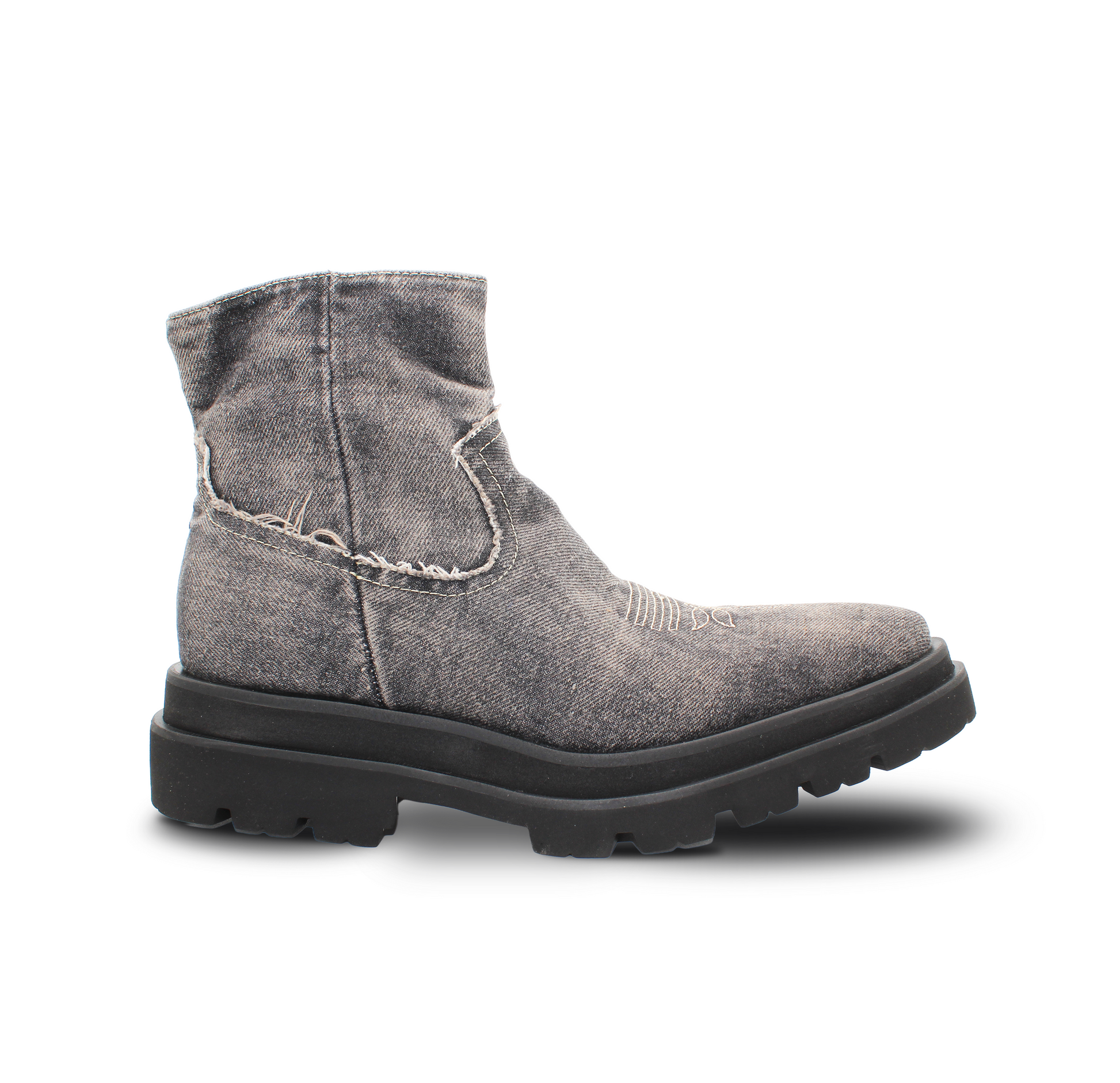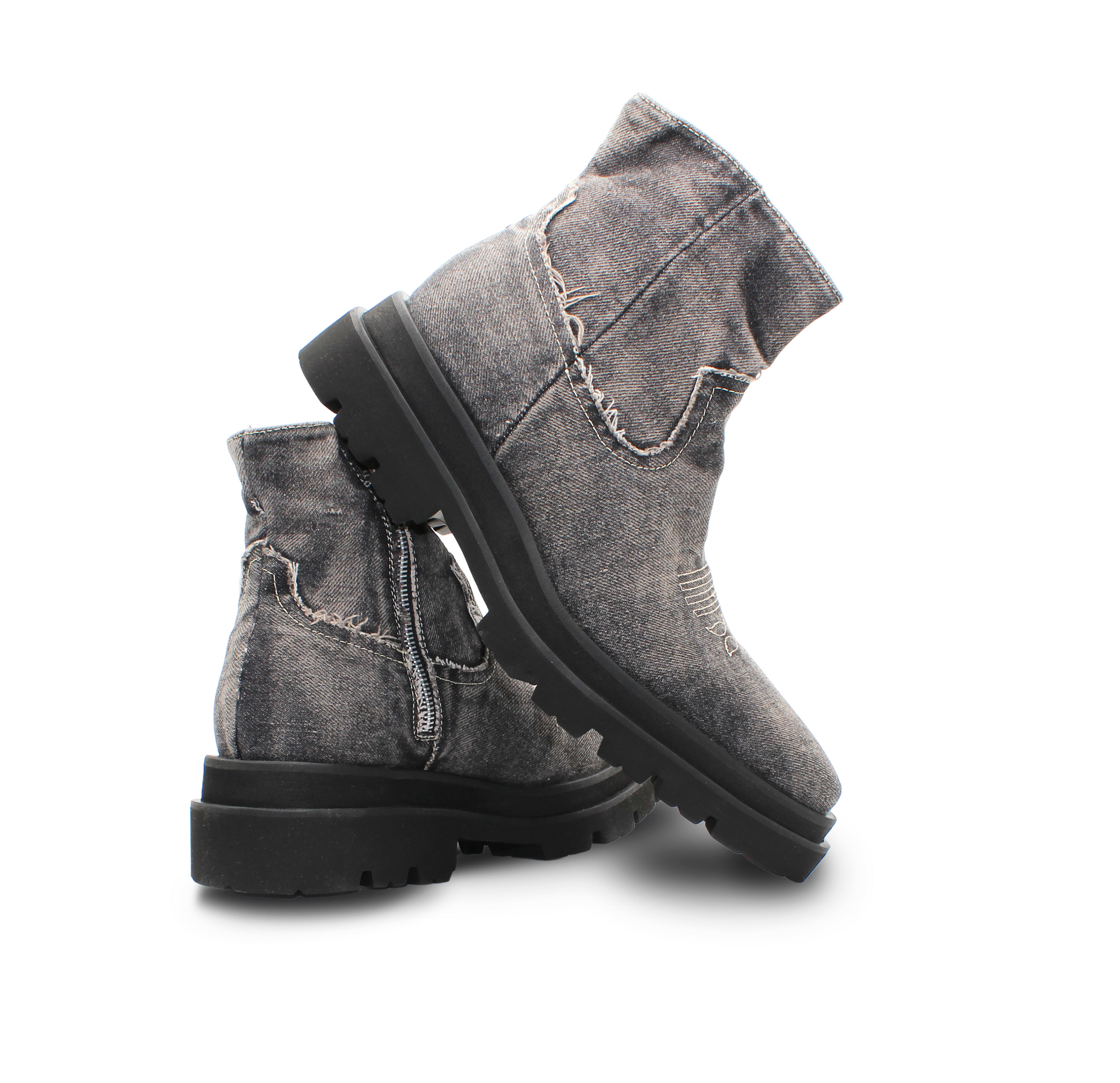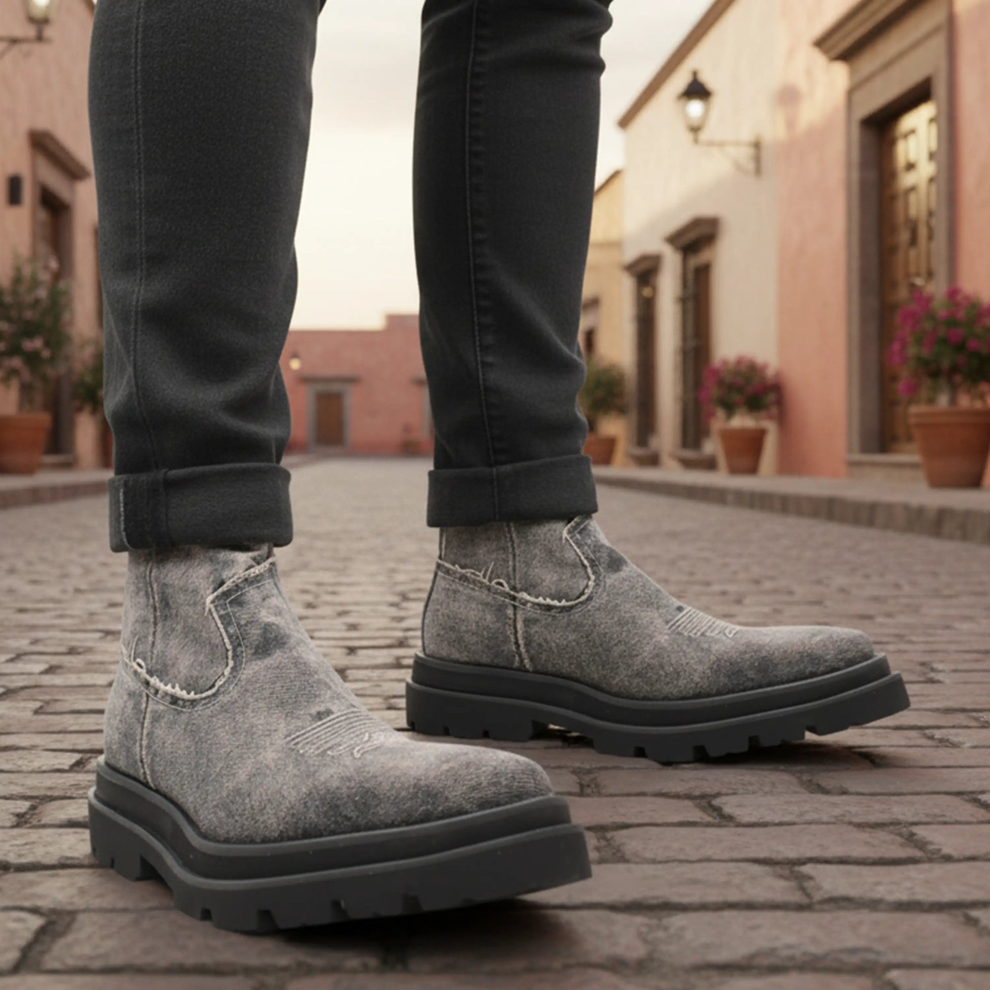 La mezclilla negra le da a esta bota un aire de misterio y sofisticación, sin perder su esencia rústica. Su cierre lateral aporta practicidad y un toque moderno, mientras que la suela chunky con tecnología ultraligera transforma cada paso en una experiencia de confort y estilo.