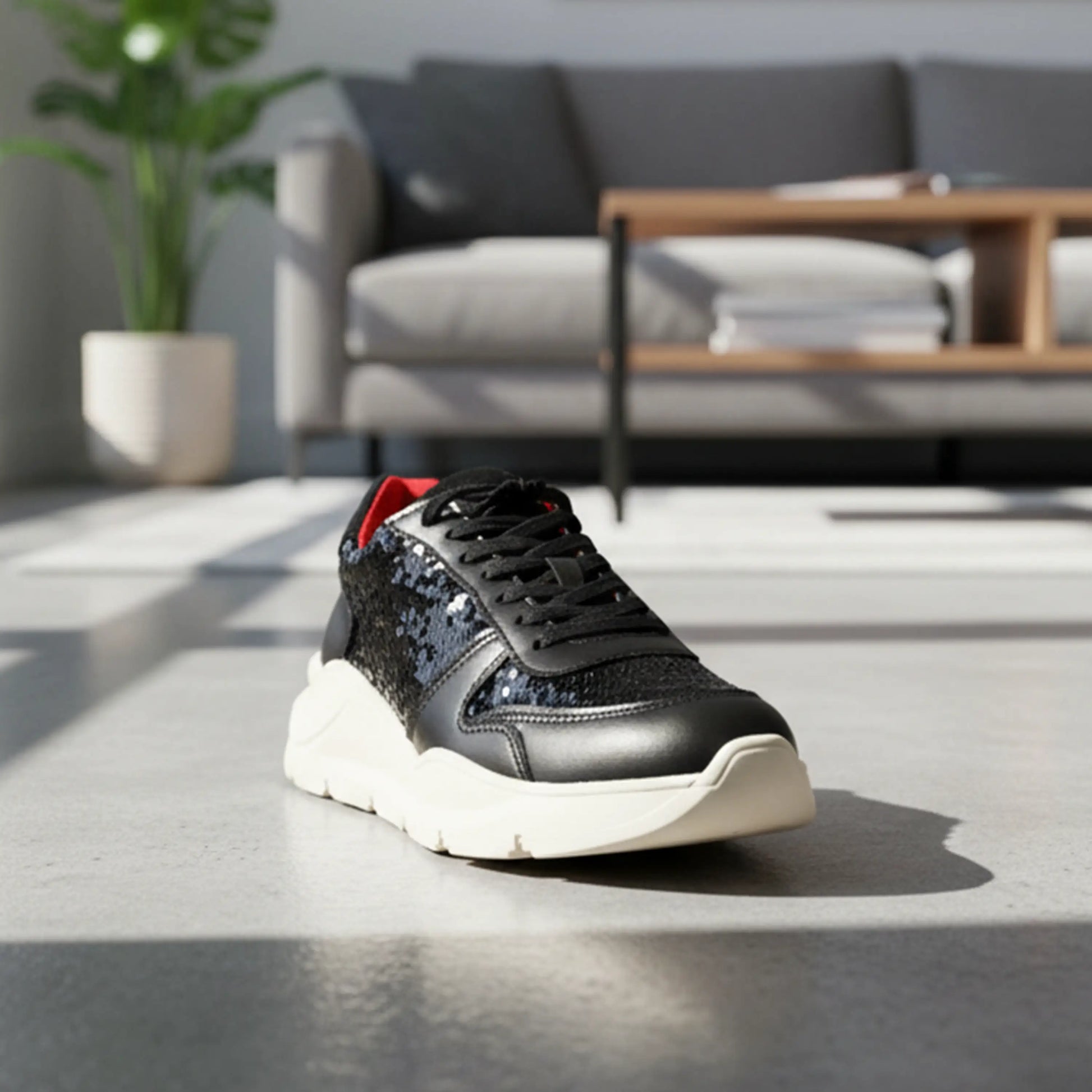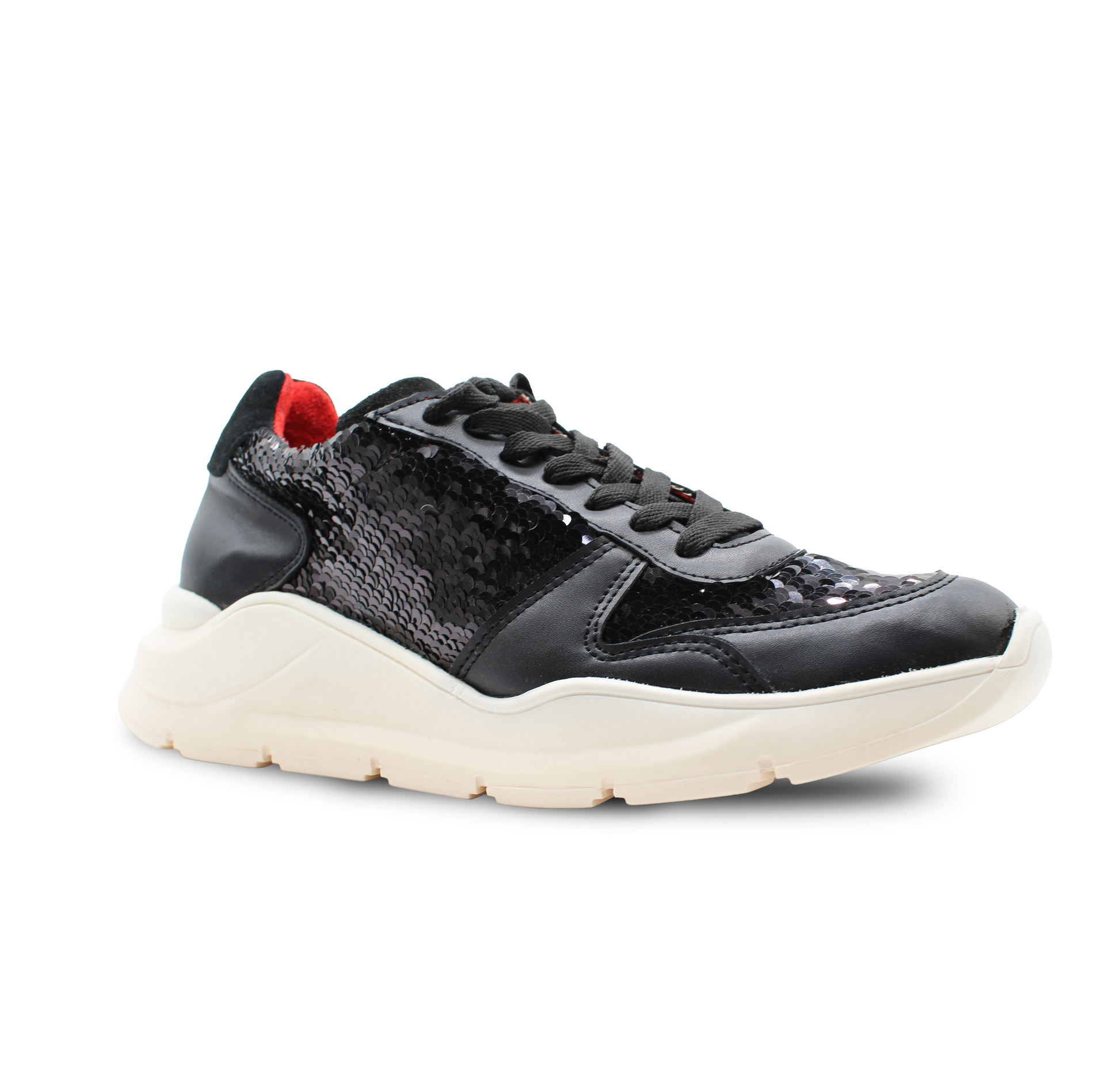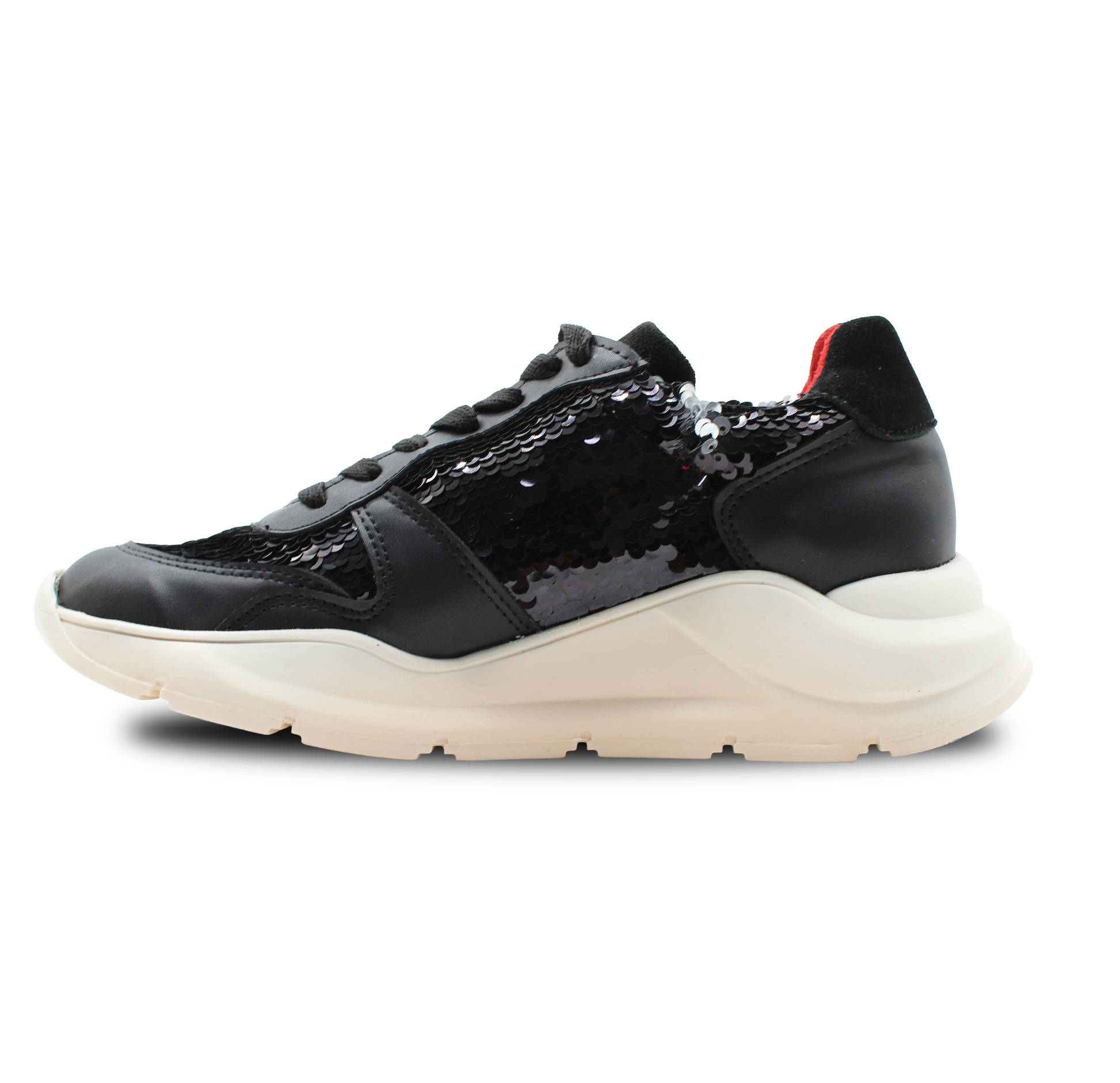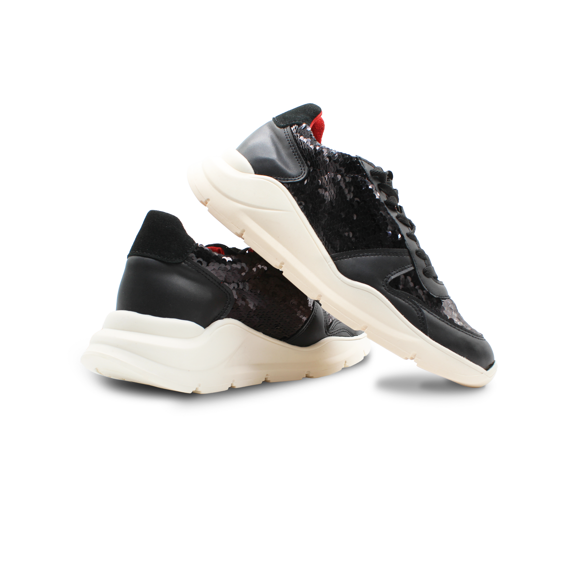 Este modelo ZULL fusiona lo deportivo con lo provocador. Su diseño en negro profundo, con acabados brillantes tipo lentejuela y paneles suaves, crea una textura visual que atrapa miradas sin perder elegancia. El acento rojo en el talón añade un destello de carácter, como una firma audaz en cada paso.