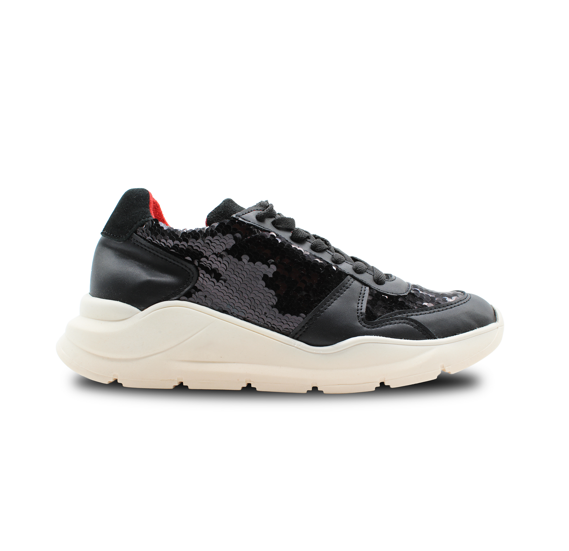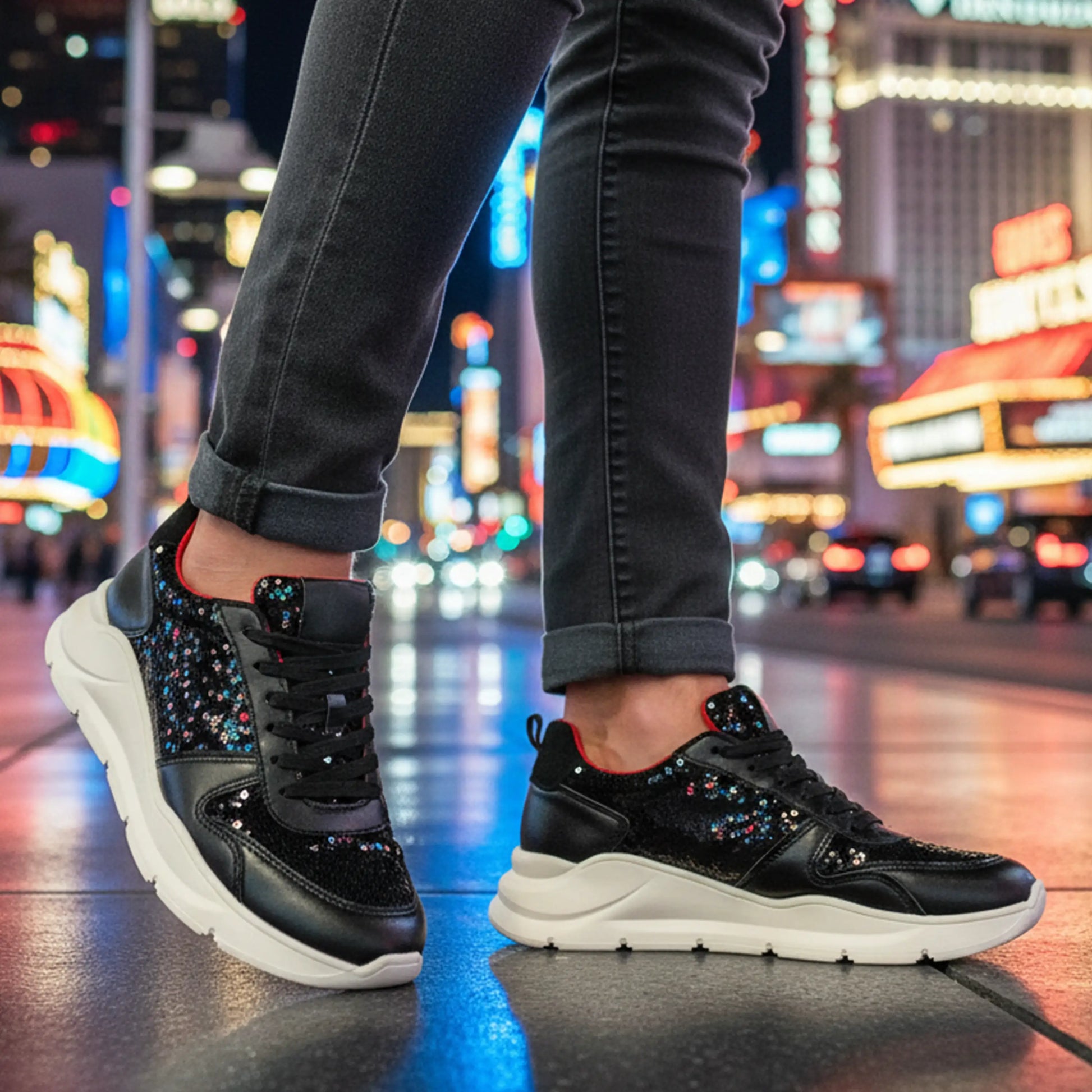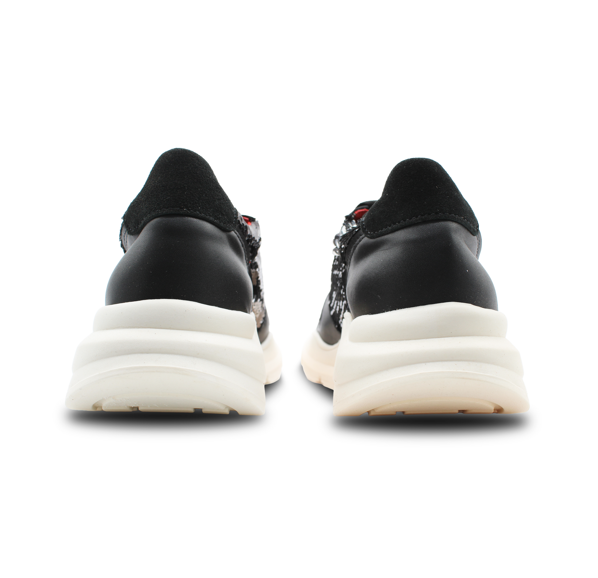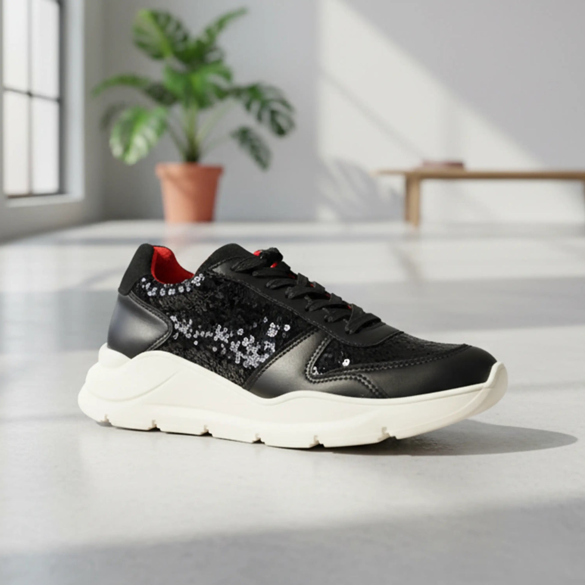 Este modelo ZULL fusiona lo deportivo con lo provocador. Su diseño en negro profundo, con acabados brillantes tipo lentejuela y paneles suaves, crea una textura visual que atrapa miradas sin perder elegancia. El acento rojo en el talón añade un destello de carácter, como una firma audaz en cada paso.