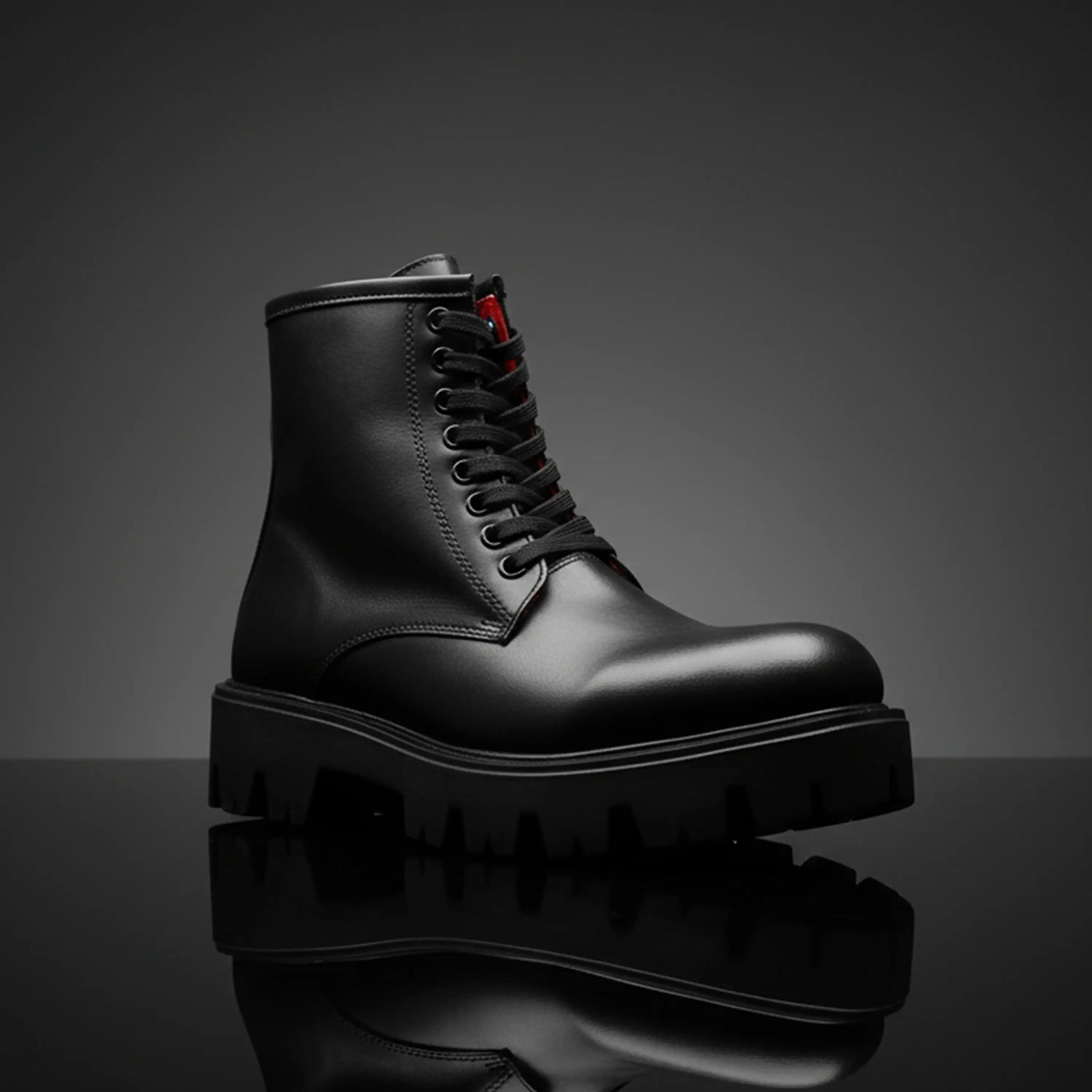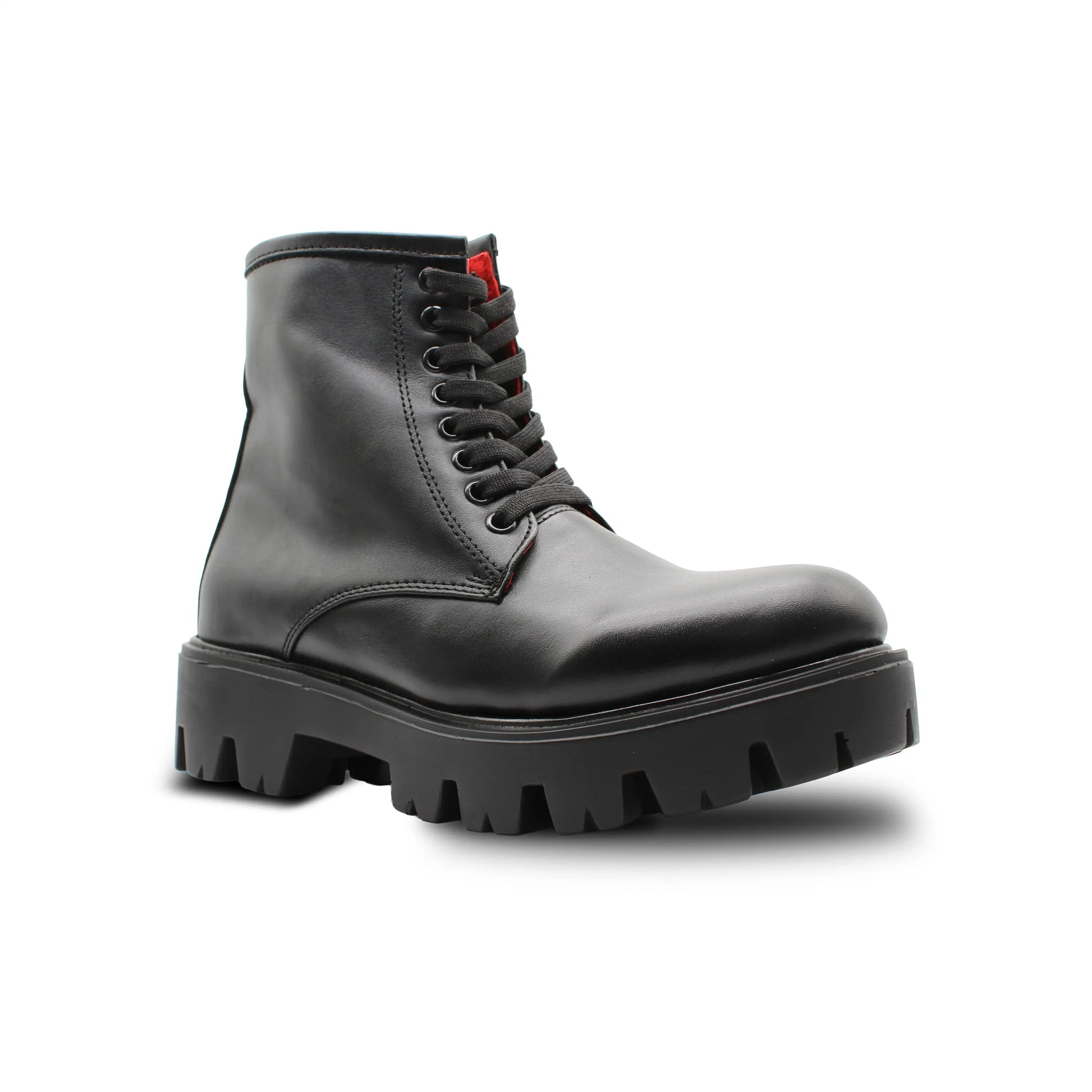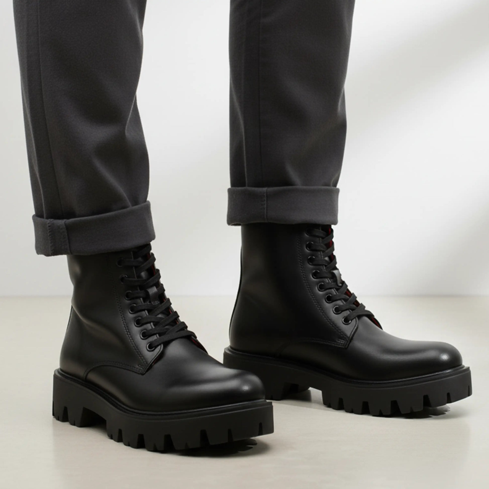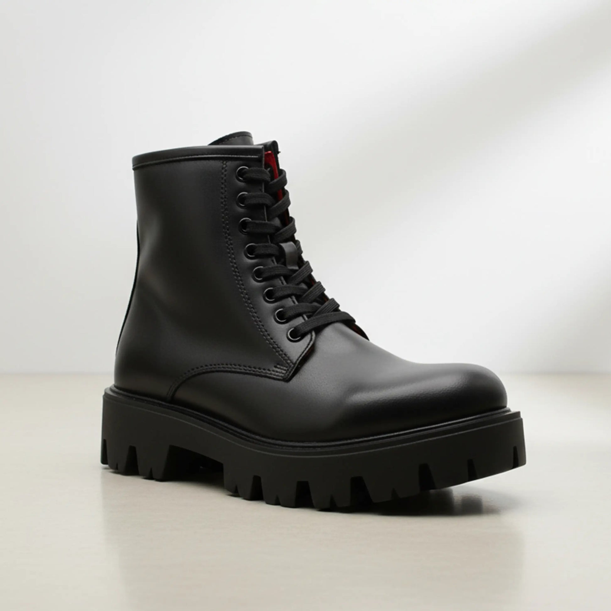 Fuerza que se siente. Estilo que se impone. Esta bota de combate está hecha para quienes pisan con convicción. Su diseño robusto, con agujetas negras y ojillos metálicos, se complementa con una suela gruesa tipo plataforma que ofrece tracción, altura y carácter. El detalle en rojo en la lengüeta añade un toque inesperado, sutilmente rebelde.