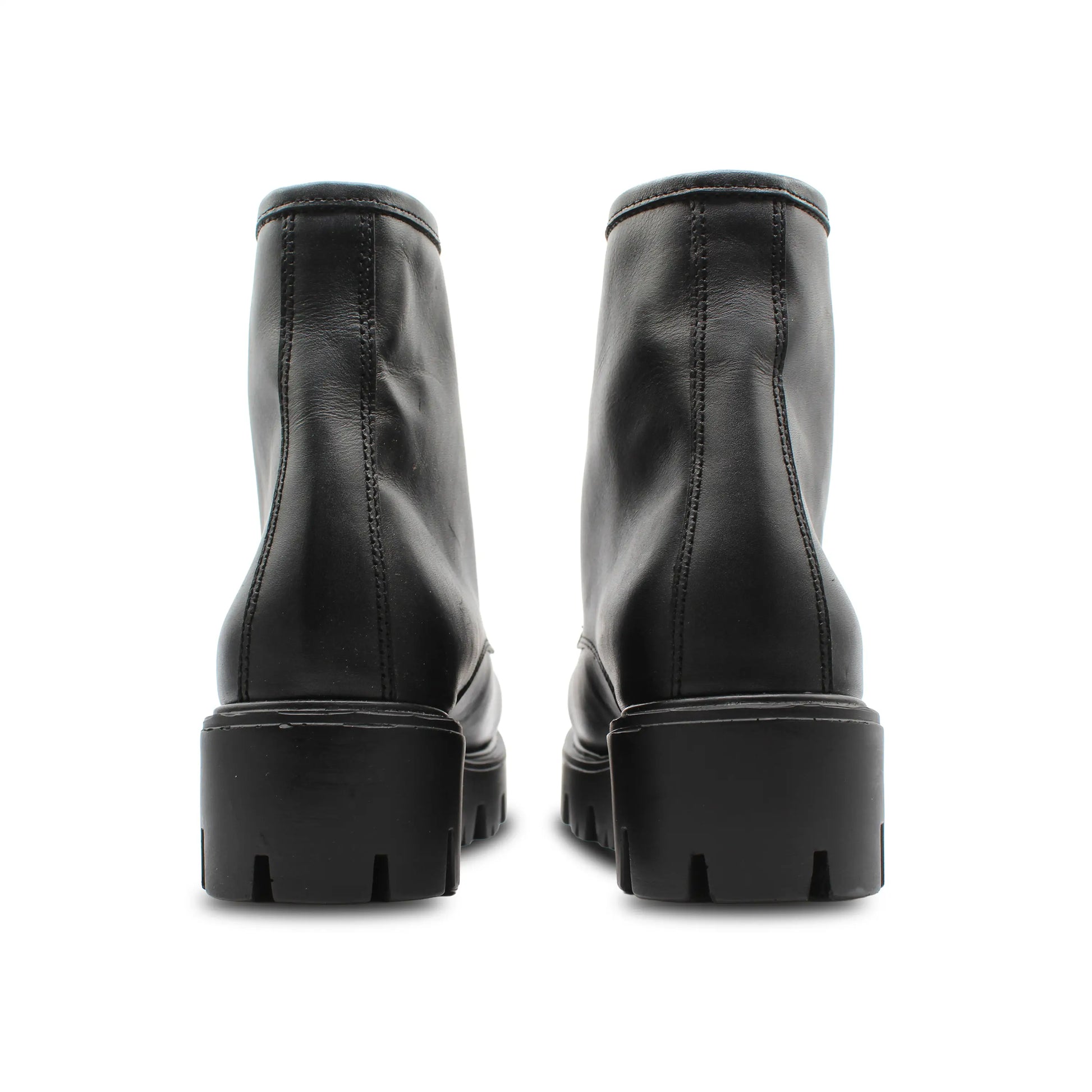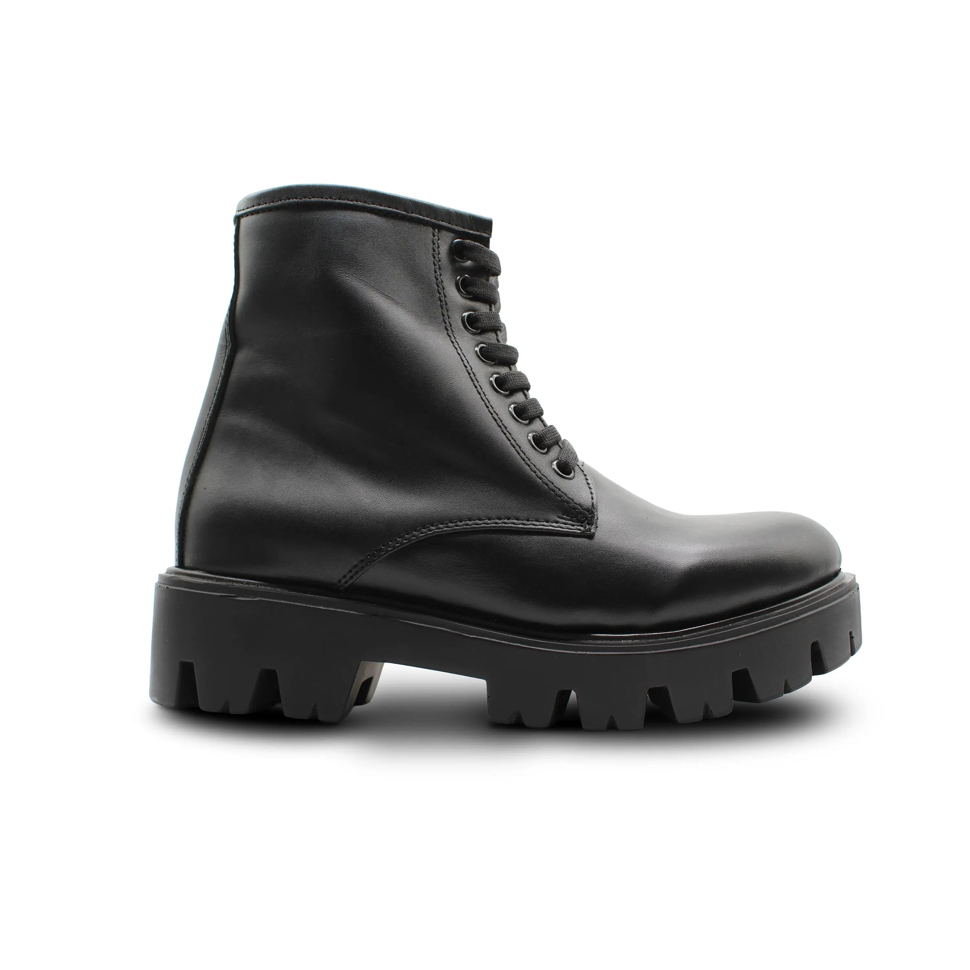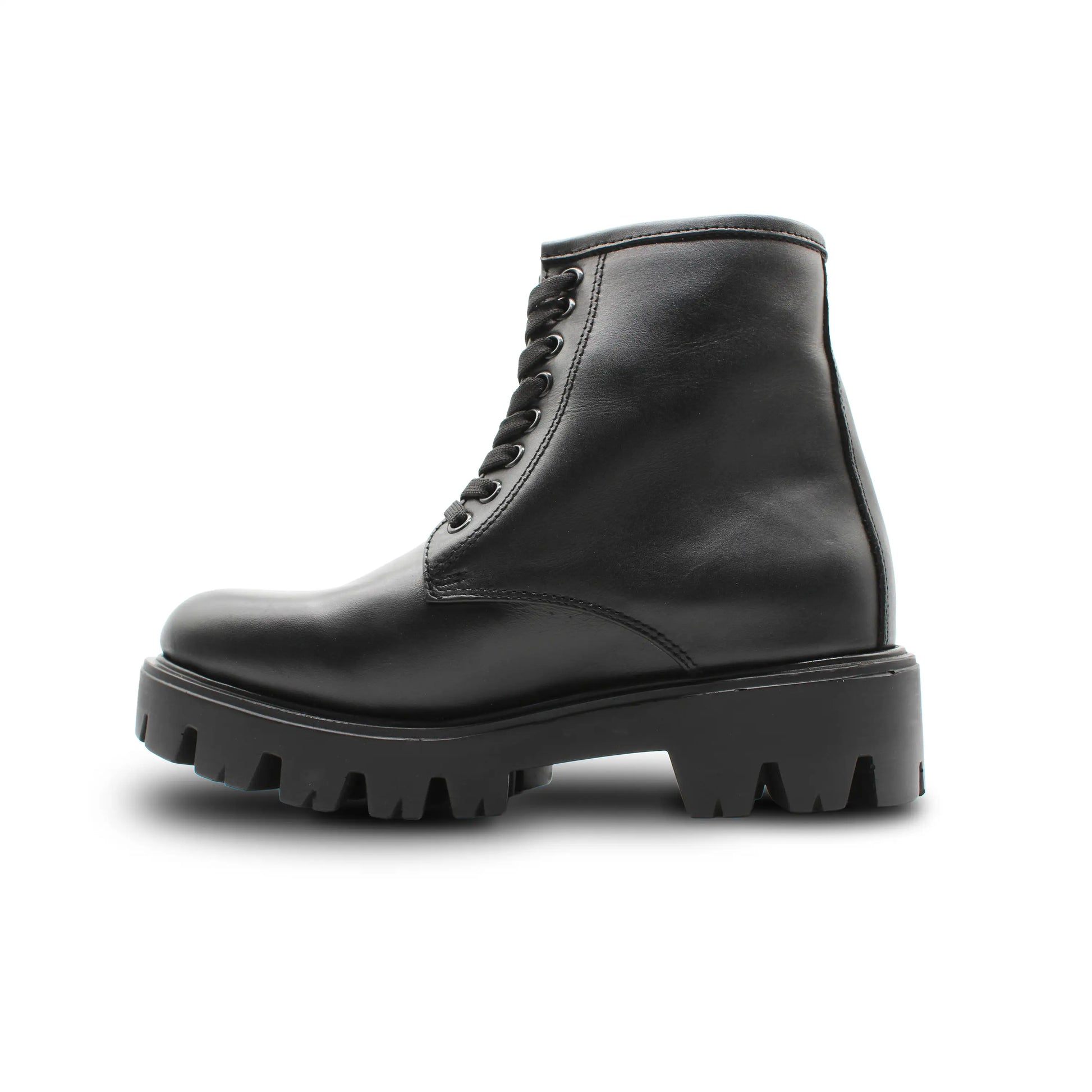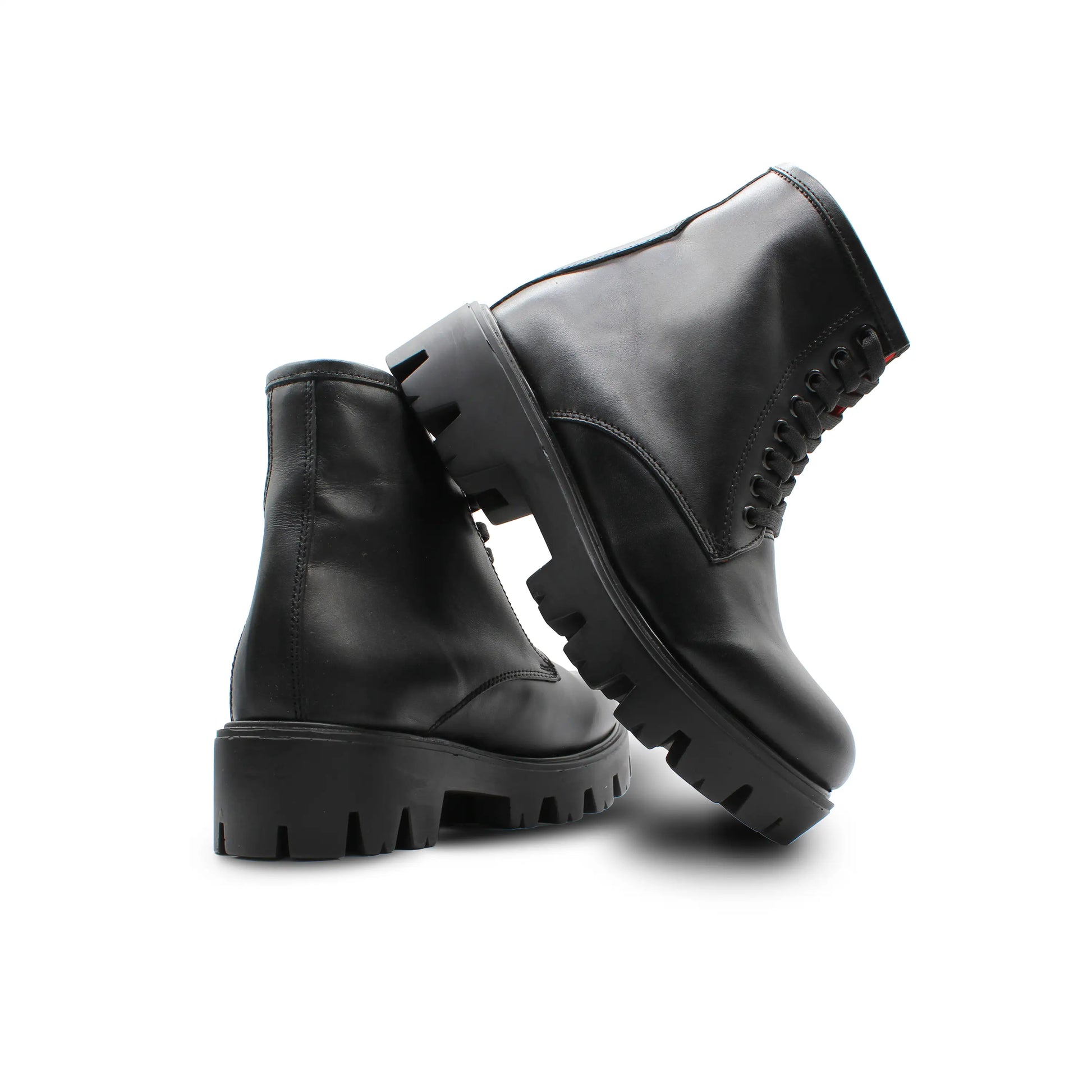 Fuerza que se siente. Estilo que se impone. Esta bota de combate está hecha para quienes pisan con convicción. Su diseño robusto, con agujetas negras y ojillos metálicos, se complementa con una suela gruesa tipo plataforma que ofrece tracción, altura y carácter. El detalle en rojo en la lengüeta añade un toque inesperado, sutilmente rebelde.