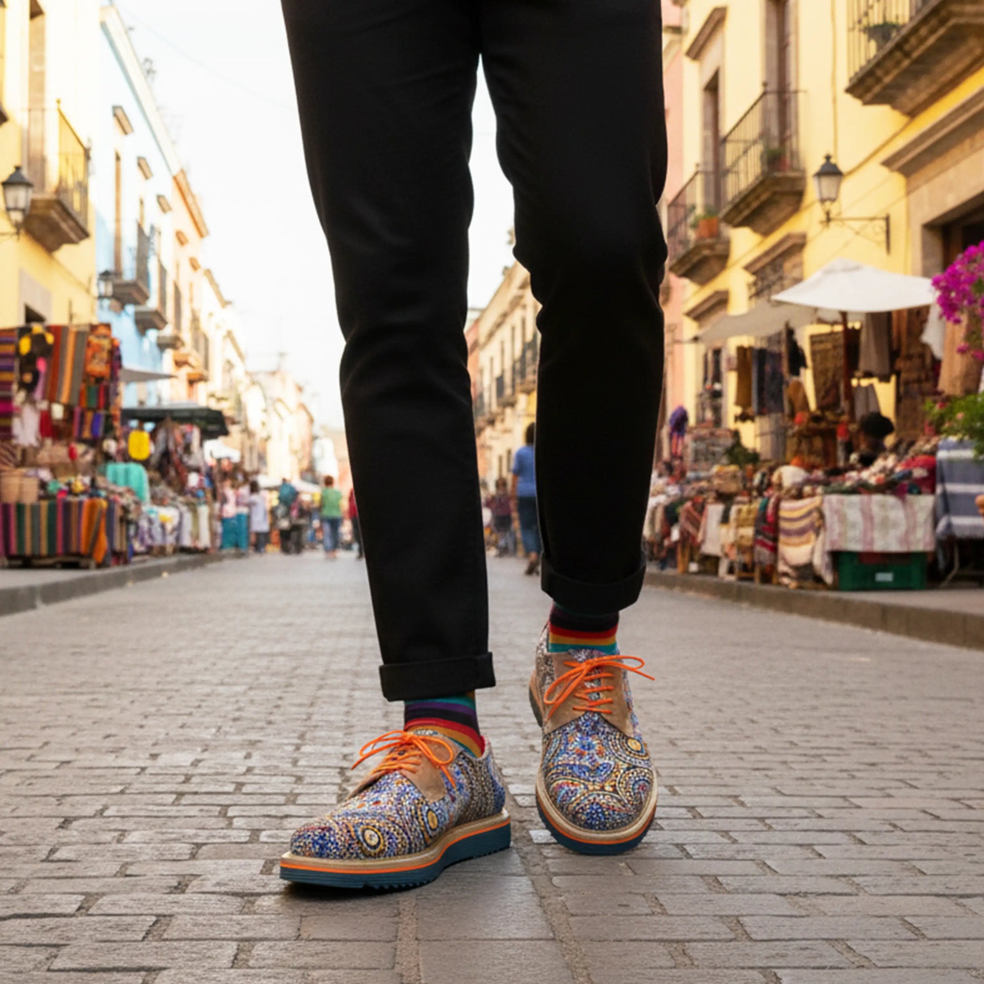 Un diseño único inspirado en la riqueza del arte y la geometría, confeccionado 100 % a mano por artesanos leoneses. Su corte textil multicolor evoca un estilo vibrante y moderno, ideal para quienes buscan destacar con originalidad y personalidad. La suela ultraligera con tecnología italiana de absorción de impacto asegura comodidad, ligereza y soporte en cada paso, fusionando tradición artesanal con innovación contemporánea.
