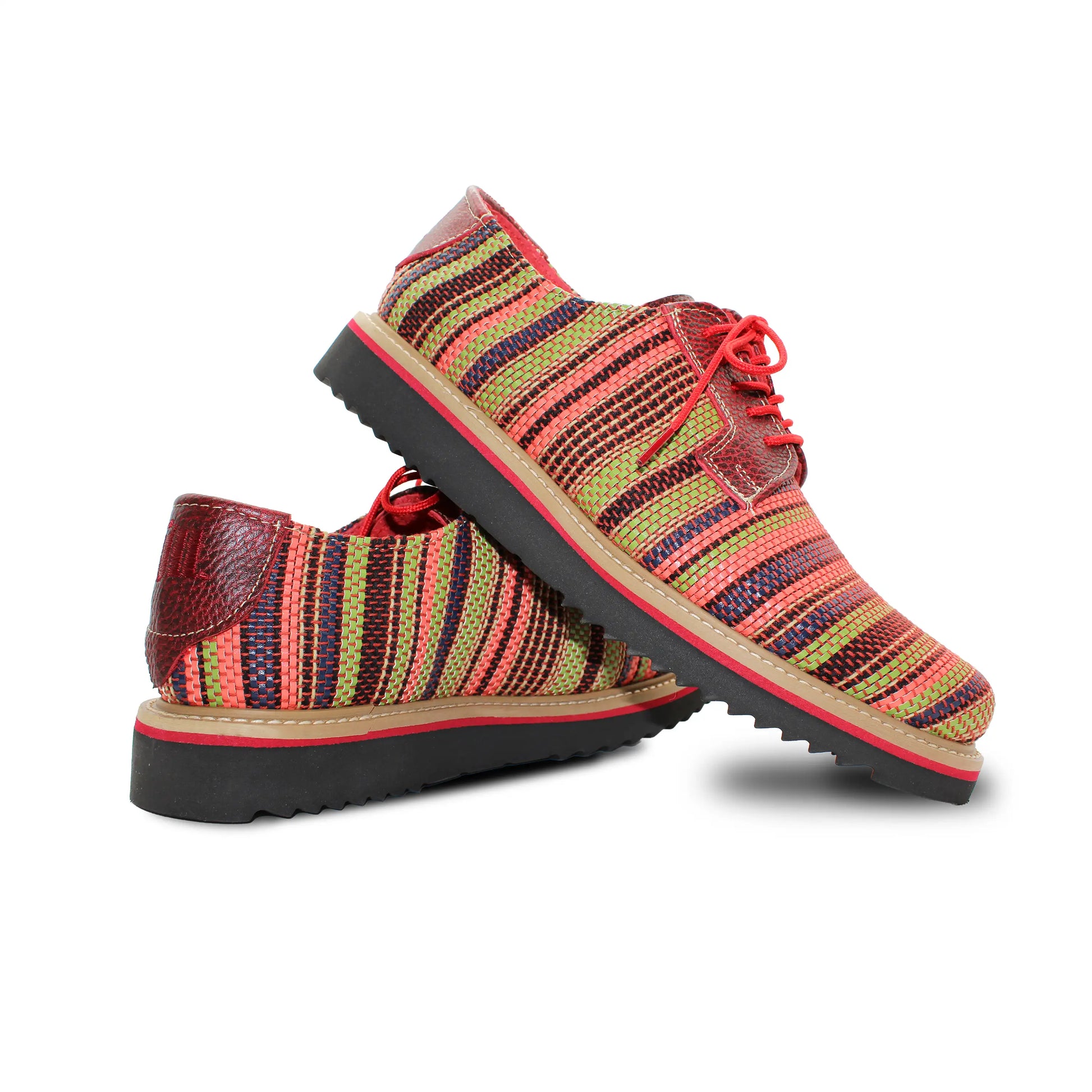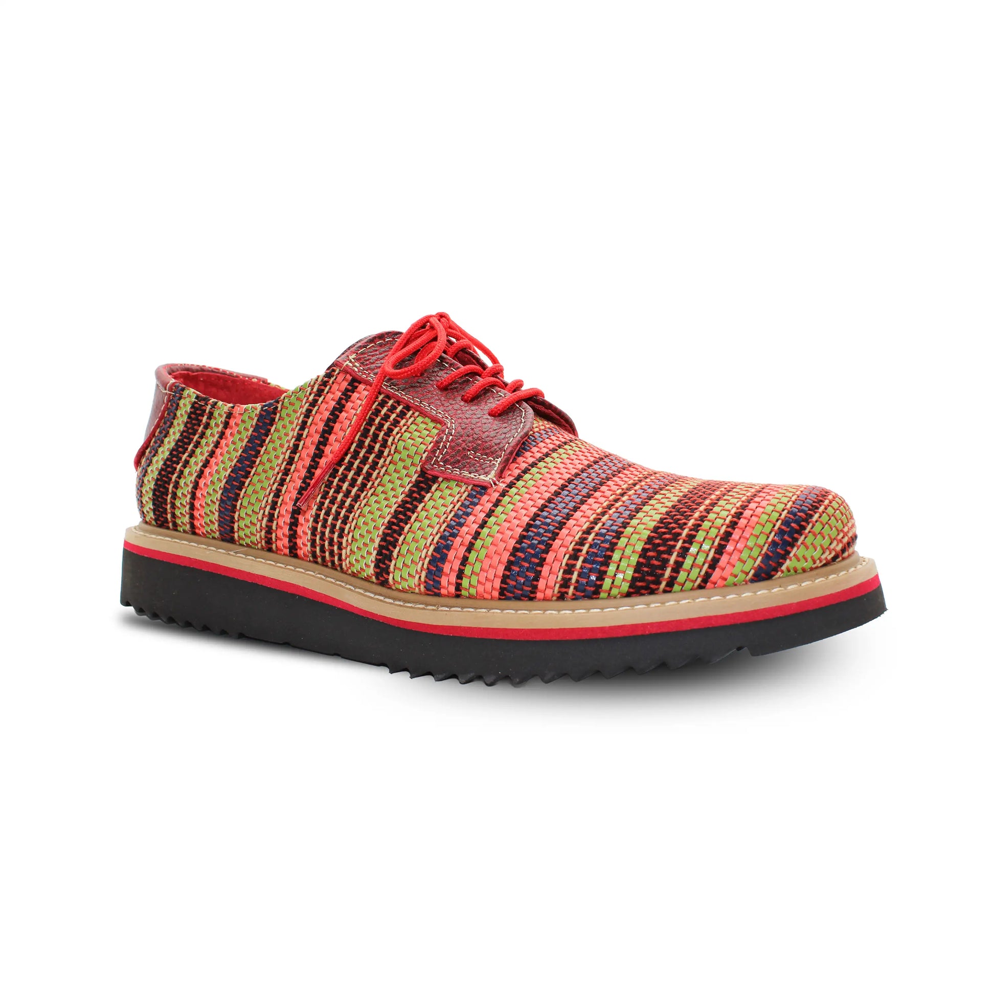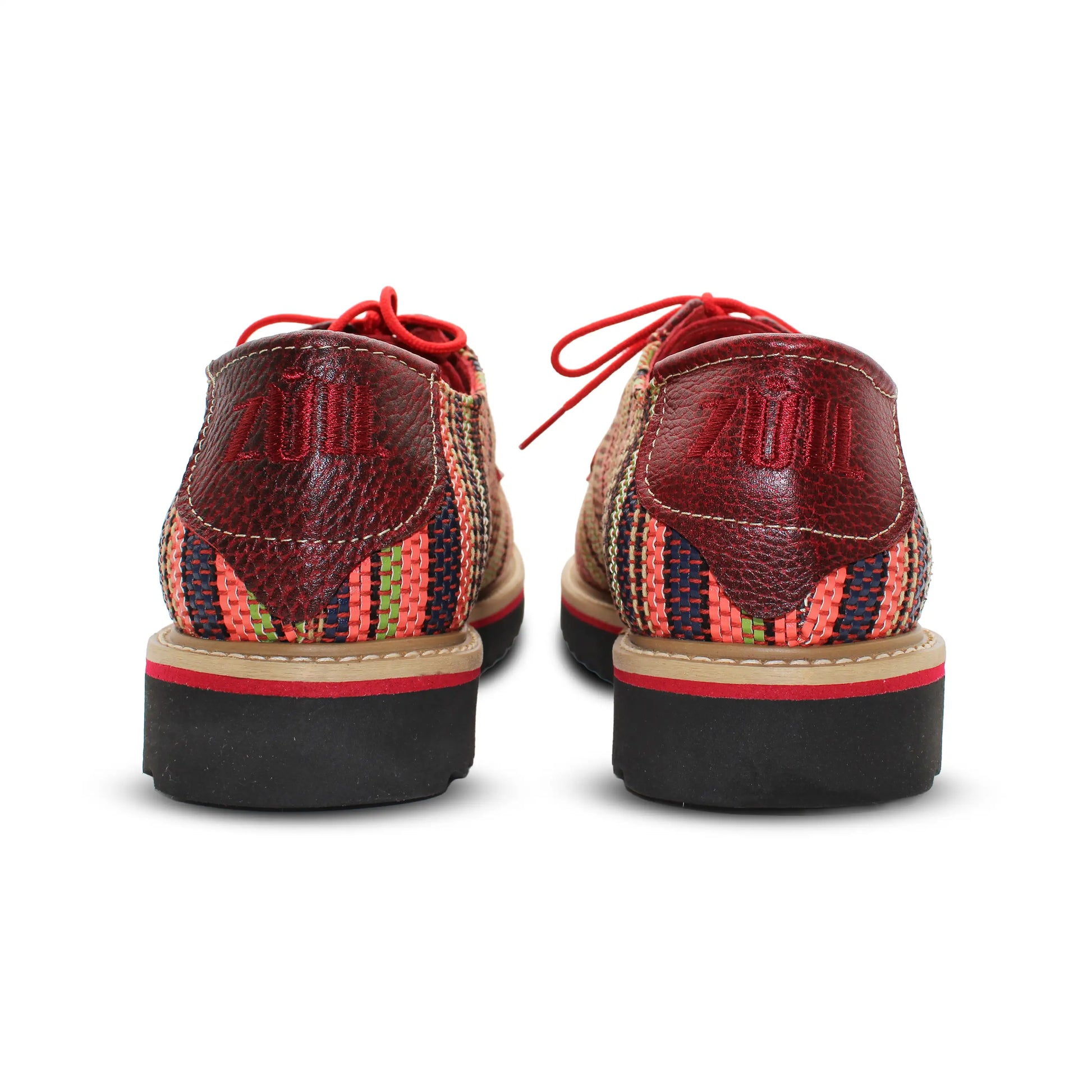 Elaborado 100% a mano por artesanos leoneses, este Derby combina tradición y estilo contemporáneo. Su corte en tejido artesanal tipo zarape resalta con tonos vibrantes en vino, rojos, verdes y amarillos, evocando la riqueza cultural mexicana en cada detalle.