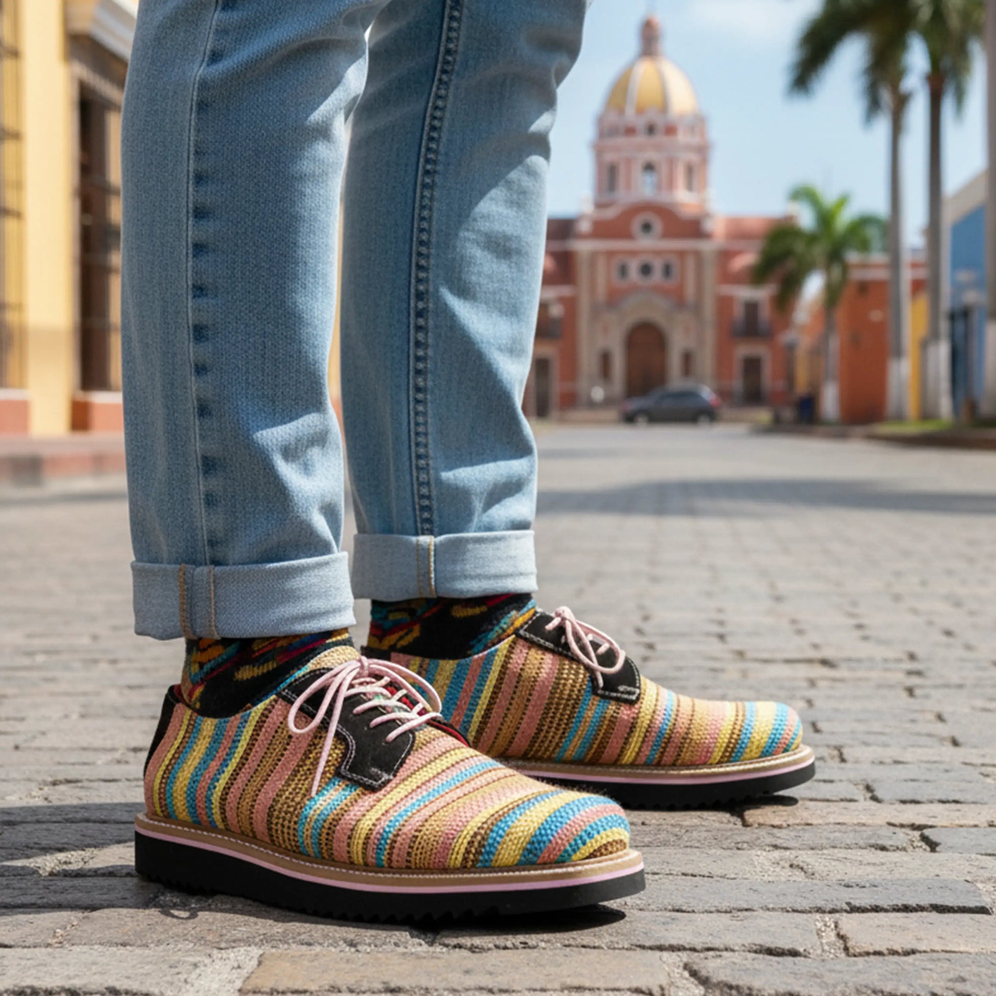 Derby para caballero elaborado en un tejido 100% artesanal, producido en León, Gto., con una paleta de tonos claros y rosas que evocan frescura y autenticidad.