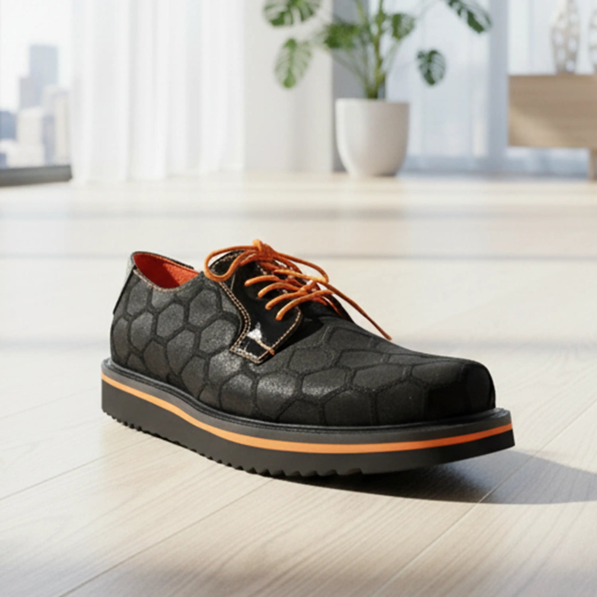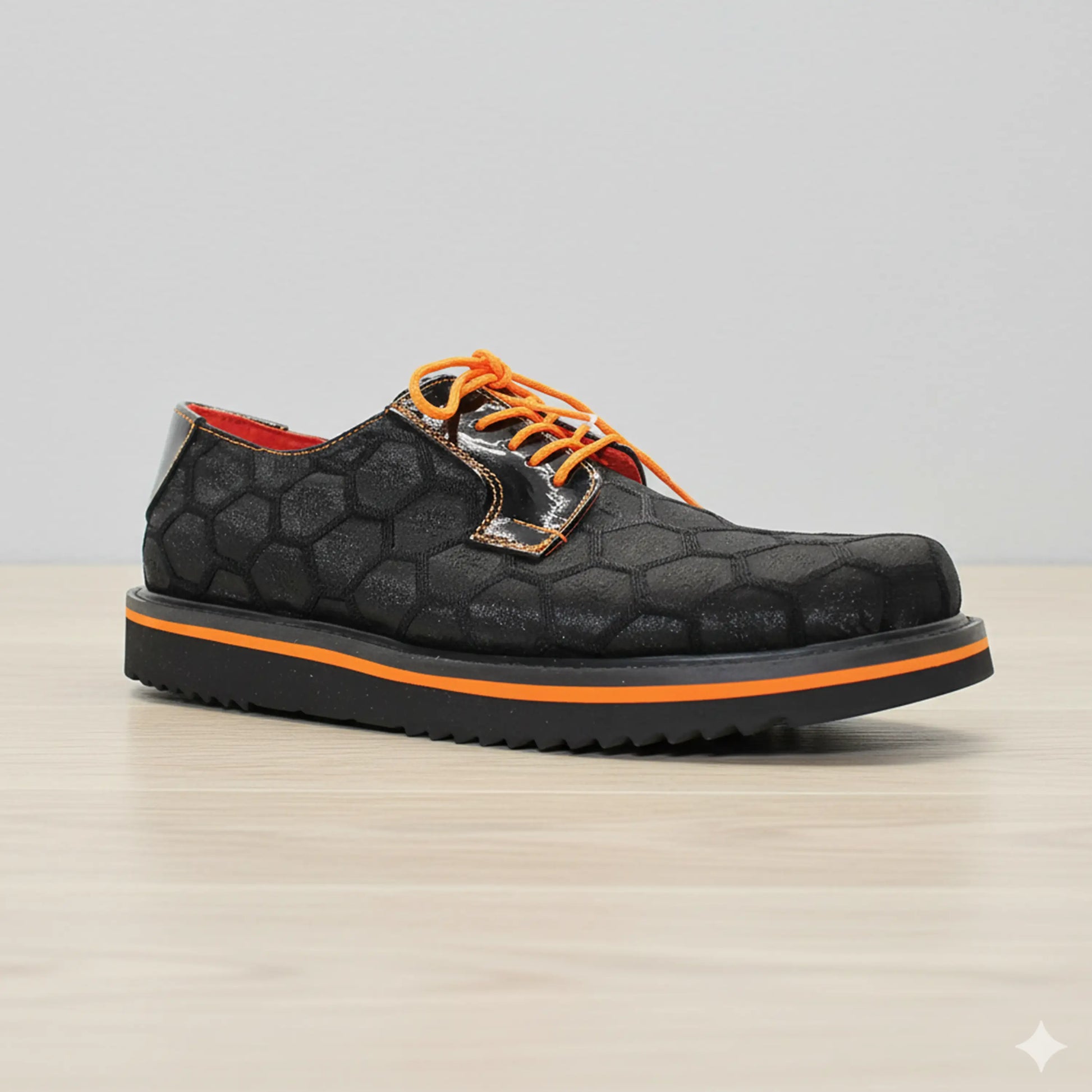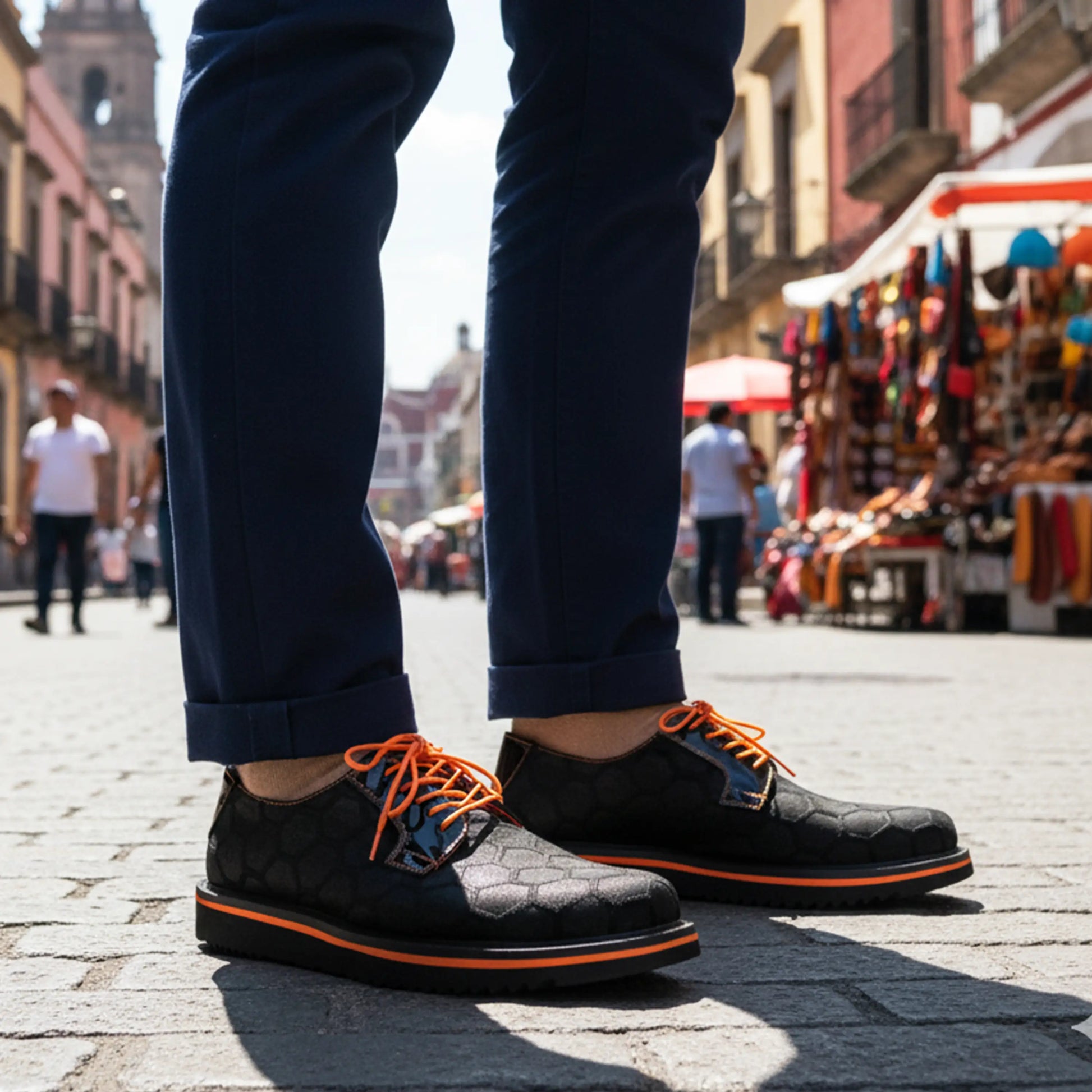 Derby para caballero fabricado en corte textil importado de la India bajo un sistema de Yakard con hilos satinados. Su diseño en panel combina acabados brillosos y mate que resaltan su carácter exclusivo. Elaborado 100% a mano por artesanos leoneses, incorpora una suela italiana de alto desempeño que brinda ligereza, soporte y una comodidad superior.