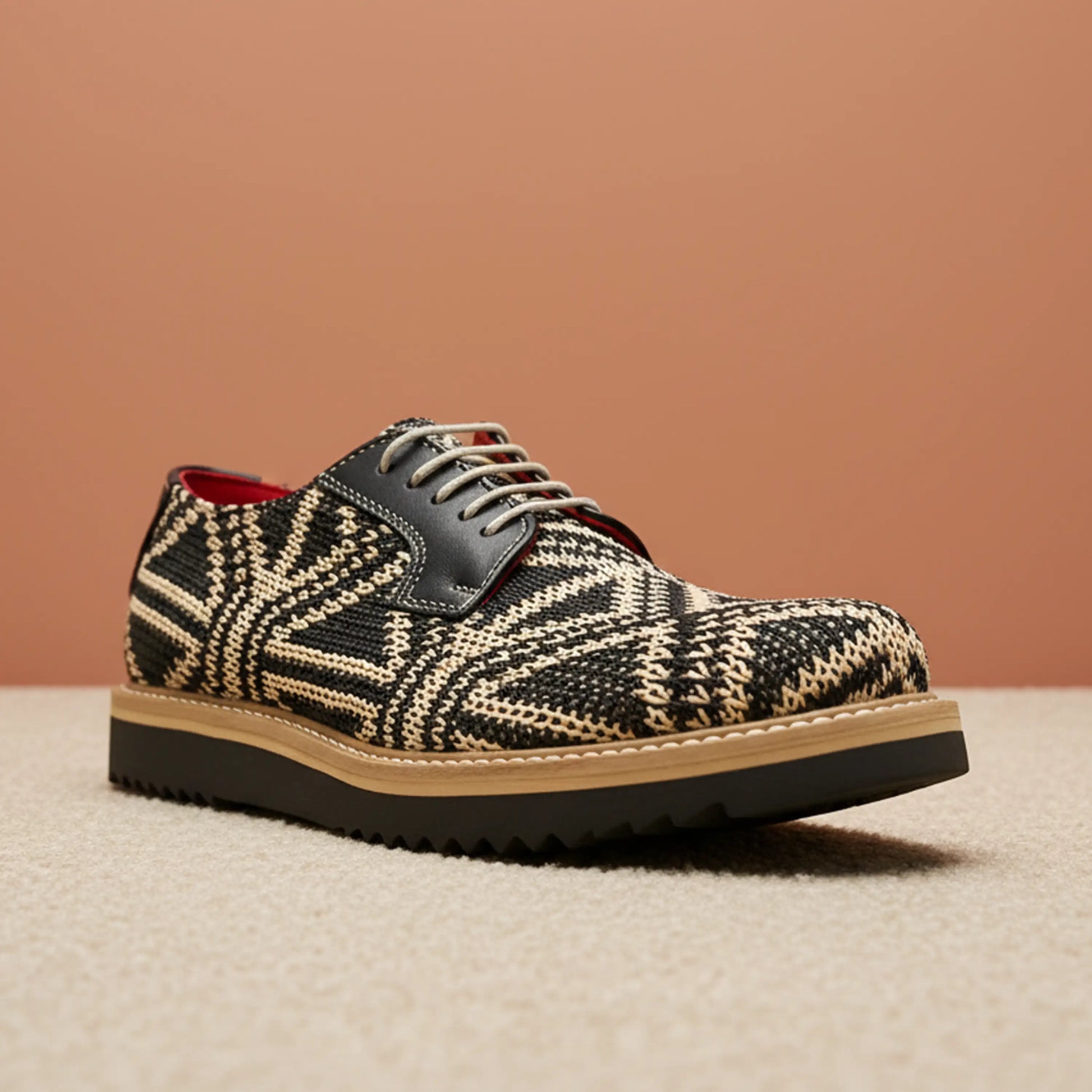 Derby para caballero fabricado en corte textil tejido 100% a mano en Elche, España. Elaborado con rafia reciclada de origen japonés, trabajada en España para dar vida a un diseño único. Hecho artesanalmente en León por manos expertas, incorpora una suela italiana de última generación que garantiza ligereza, durabilidad y un confort sobresaliente.
