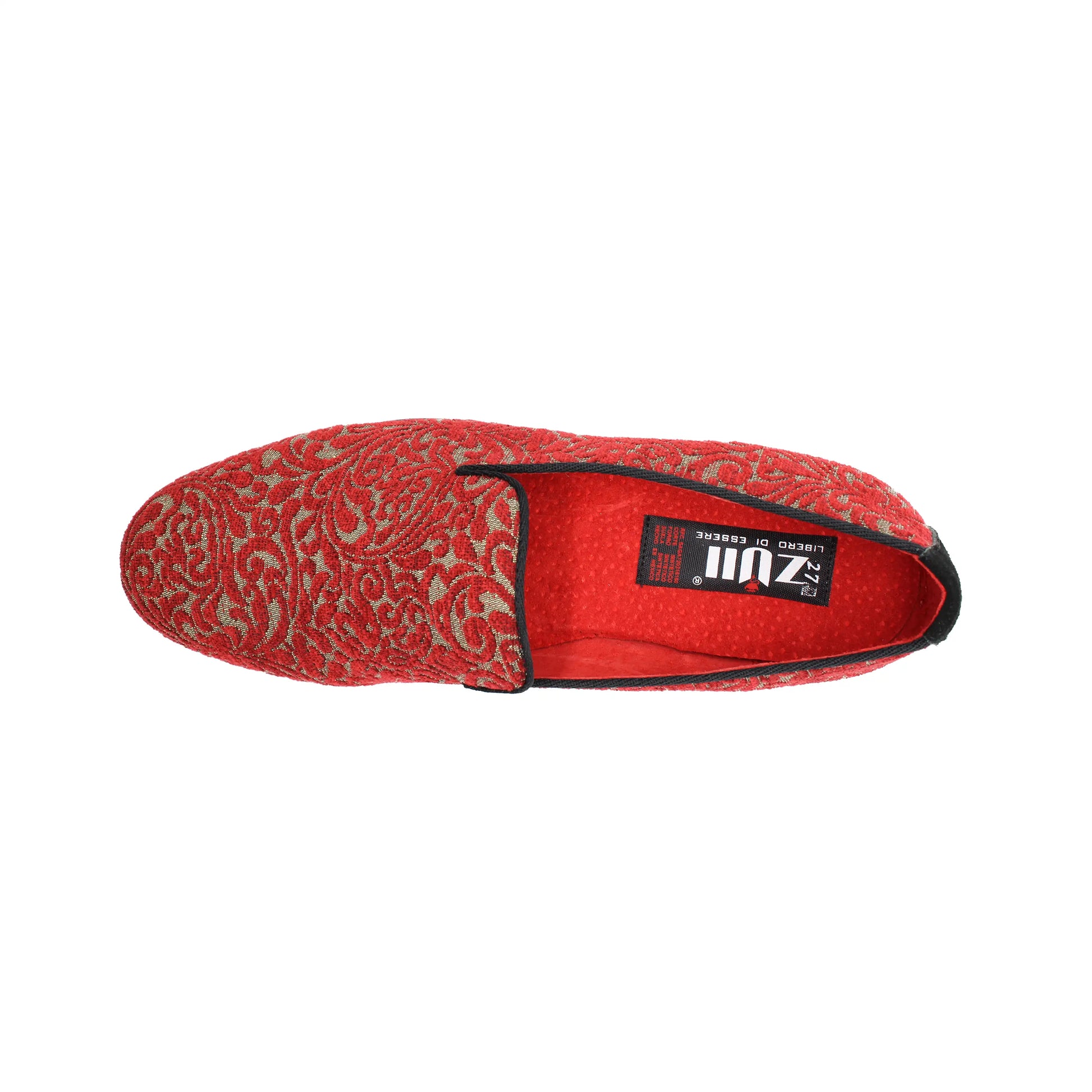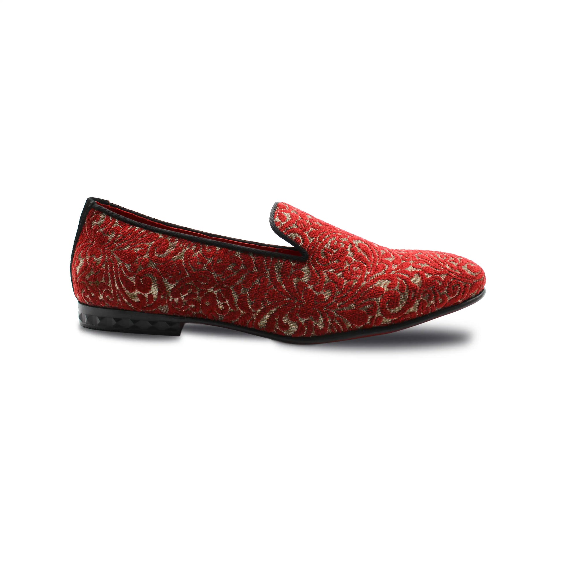 Lujo que se siente. Historia que se lleva. Este slipper es una pieza de alto impacto visual y emocional. Su textil rojo profundo, bordado con motivos dorados de inspiración barroca, evoca opulencia, arte y distinción. El ribete negro en la abertura aporta contraste y estructura, mientras que la suela baja con detalles metálicos en el talón añade un guiño moderno a una silueta clásica.