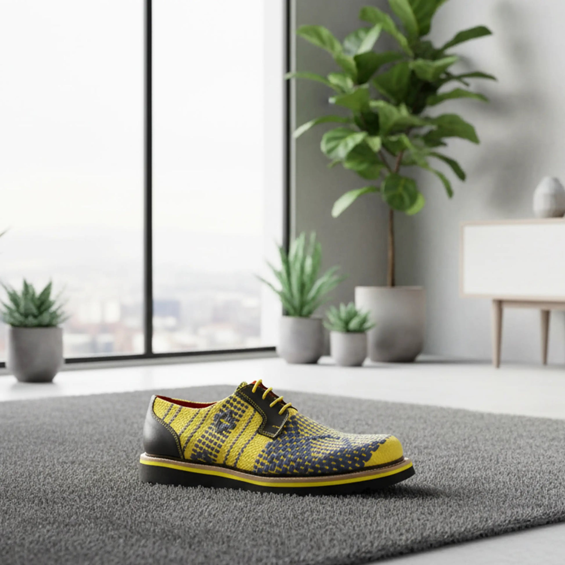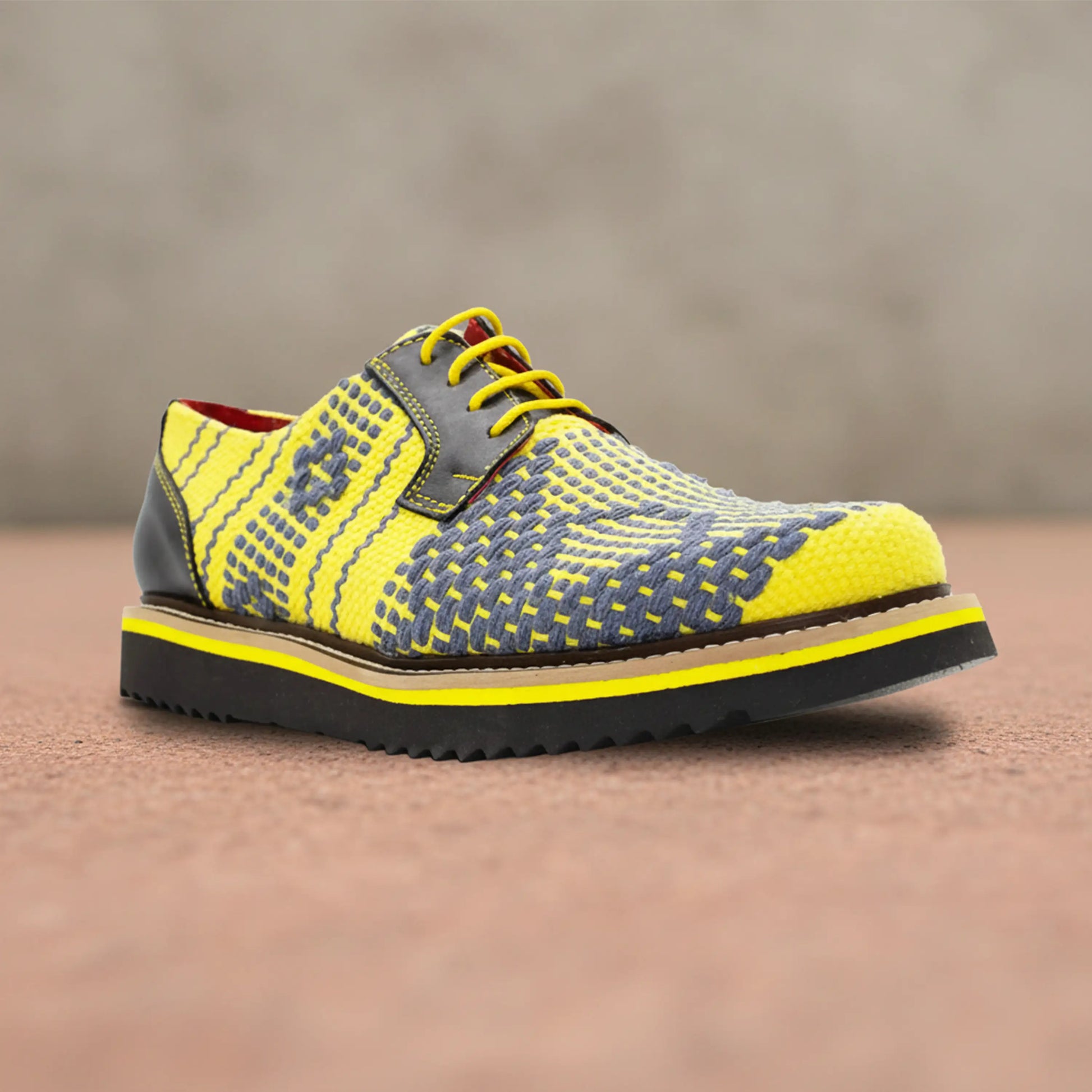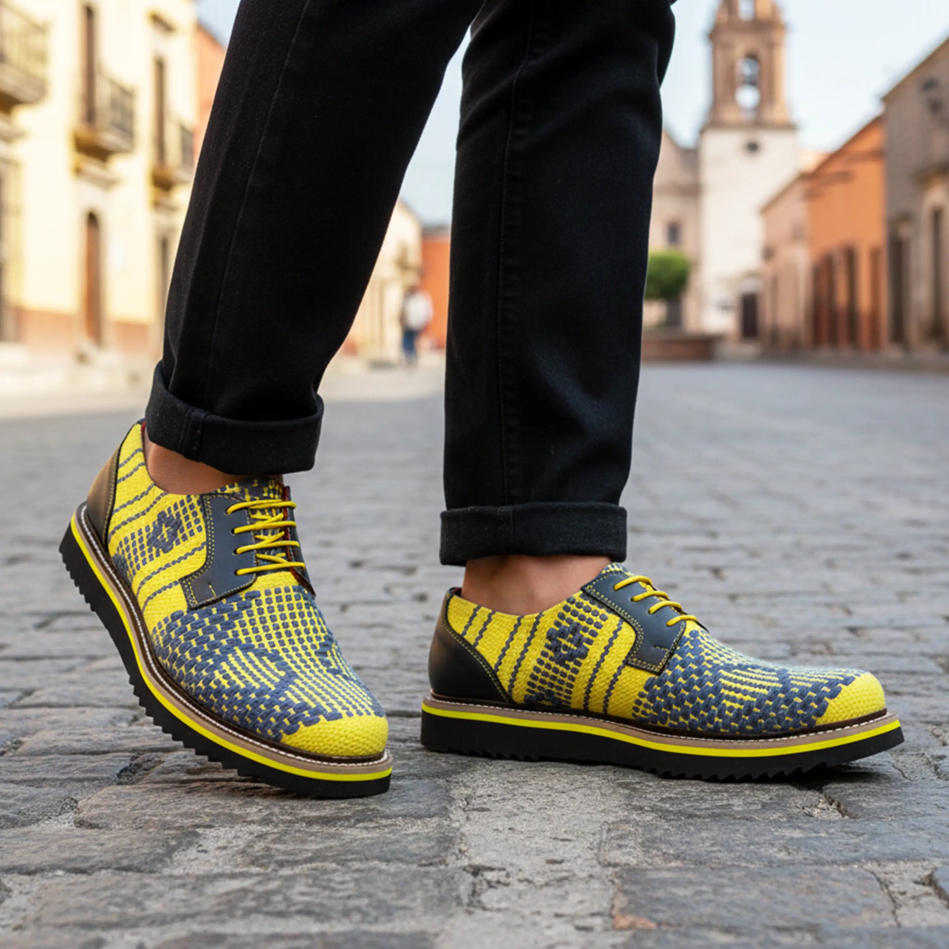 Los detalles en piel negra aportan firmeza y sofisticación, mientras que las costuras en tono mostaza refuerzan su carácter artesanal. La suela negra con línea amarilla cierra el diseño de manera equilibrada, ofreciendo comodidad y estilo en cada paso.